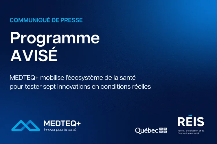 Montréal, 27 avril 2026 — MEDTEQ+ dévoile les sept projets collaboratifs retenus dans le cadre du premier dépôt de son programme d’appui à la validation, à l’innovation en santé et à l’évaluation (AVISÉ). Lancé en juin 2025 afin de soutenir les entreprises québécoises ayant développé une technologie médicale ou en santé numérique proche de la commercialisation, le programme AVISÉ finance la réalisation d’une étude en milieu réel afin de démontrer la valeur globale d‘innovations pour leurs futurs clients, soit l’impact économique, populationnel, clinique, organisationnel, socioculturel et environnemental.